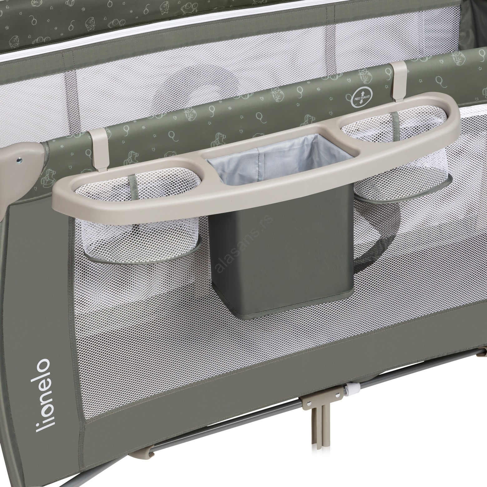 U paketu: previjalni pult sa bočnim džepovima (za pelene, puder itd.), korpa za pribor sa dve pregrade, velika mreža protiv komaraca, baldahin i prečka sa plišanim igračkama.