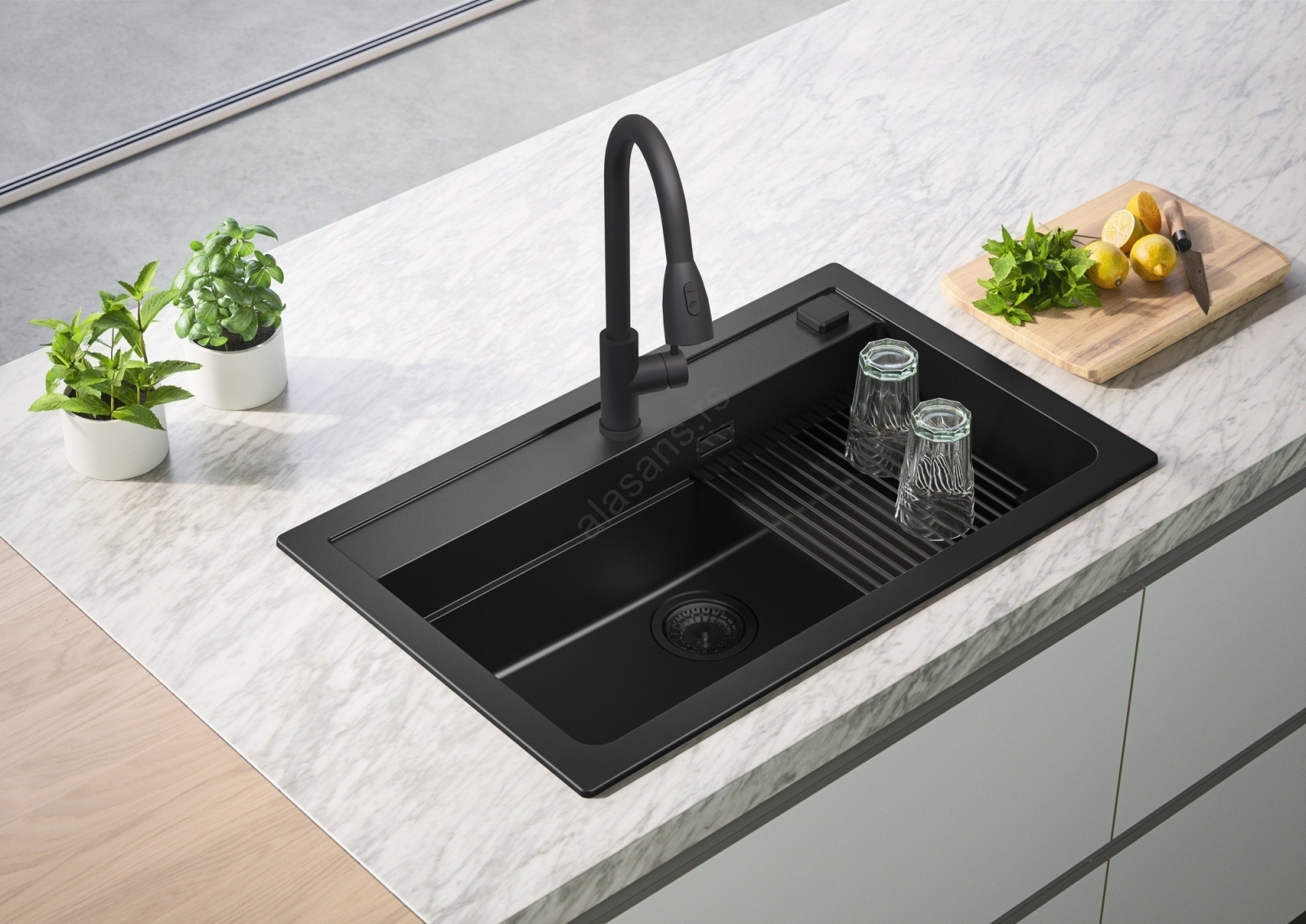 • Sadržaj pakovanja: granitni sudoper, stege za gornju montažu, sito ventil 3 1/2, sifon sa priključkom za mašinu za pranje sudova, ekscentrično upravljanje odvoda.