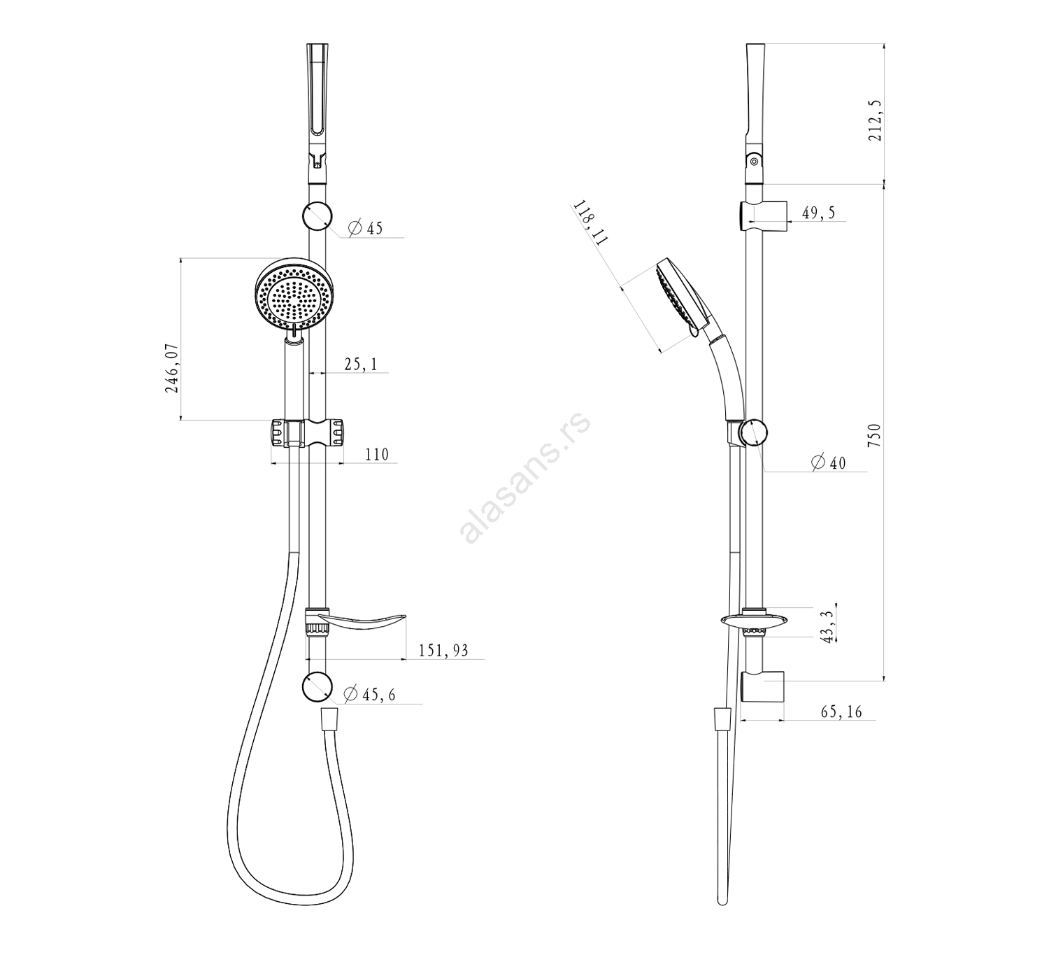 • Set sadrži: tuš ručicu, držač za ručni tuš, posudu za sapun i crevo od nerđajućeg čelika dužine 150 cm.