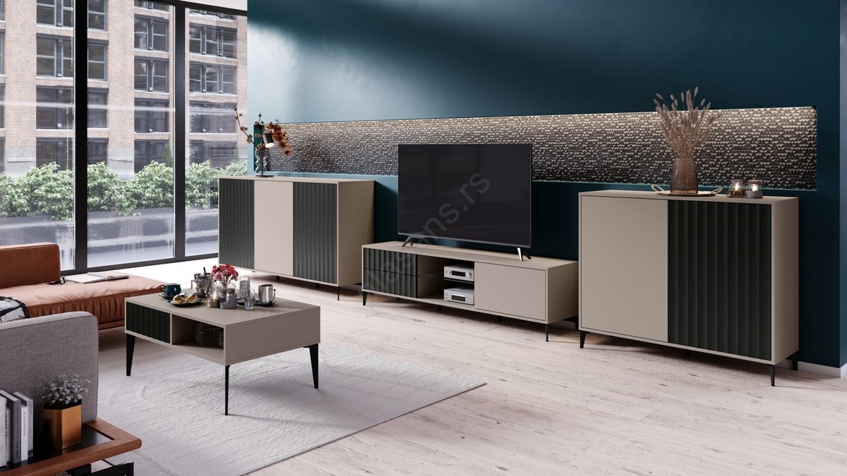 • Minimalistički set nameštaja za dnevnu sobu odlikuje se jednostavnim oblicima i rebrastim frontama koje stvaraju jedinstven i otmen izgled.