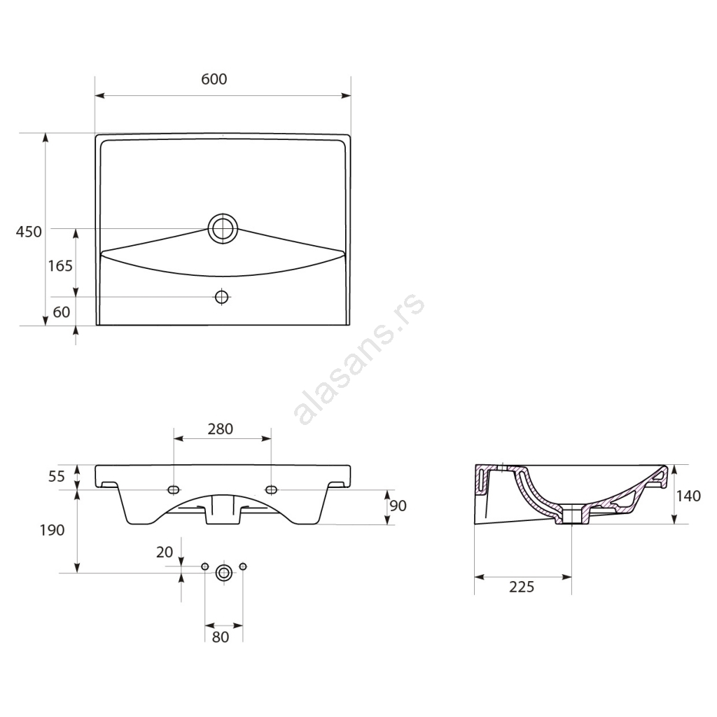 • Keramički umivaonik ima klasičan pravougaoni oblik sa otvorom za slavinu i prelivom.