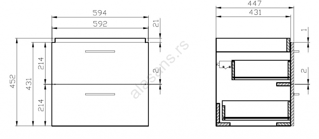 • Ormarić ima dve prostrane fioke sa funkcijom mekog zatvaranja i hromiranim ručkama.
