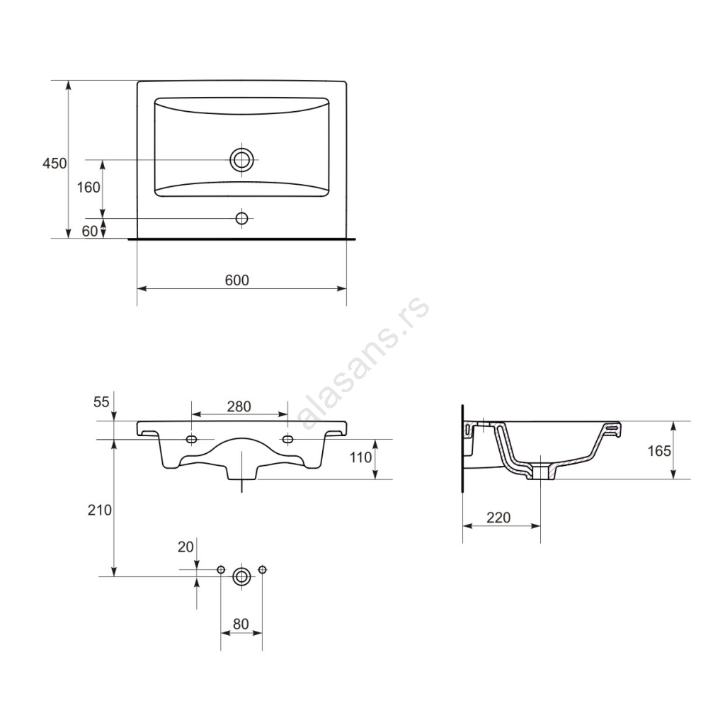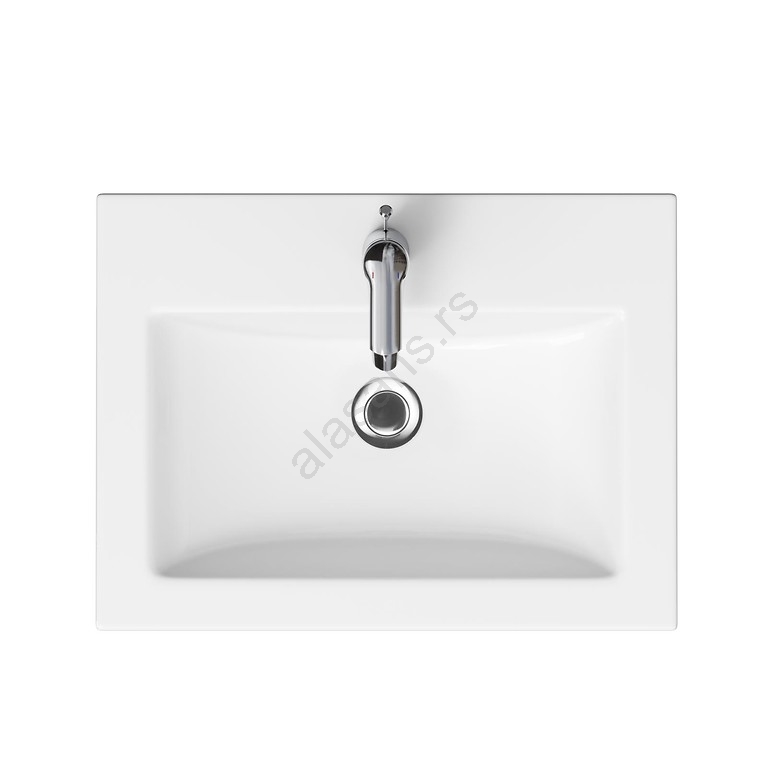 • Keramički umivaonik ima klasičan pravougaoni oblik sa otvorom za bateriju i prelivom.