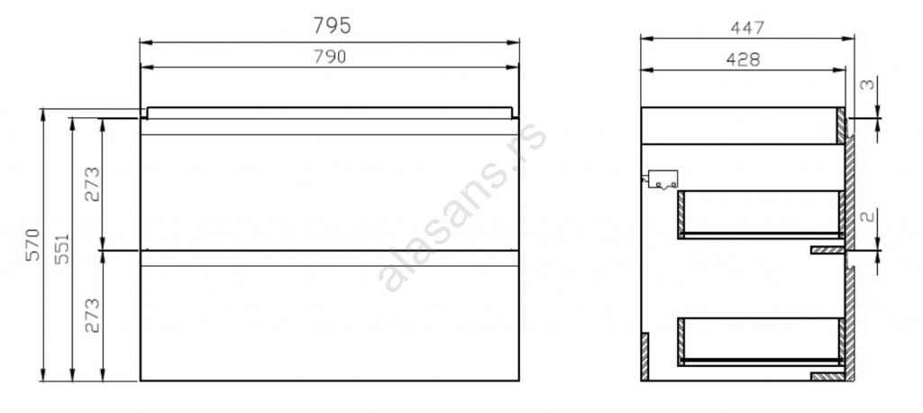 • Ormarić ima dve prostrane fioke sa mehanizmom mekog zatvaranja i skrivenim ručkama.