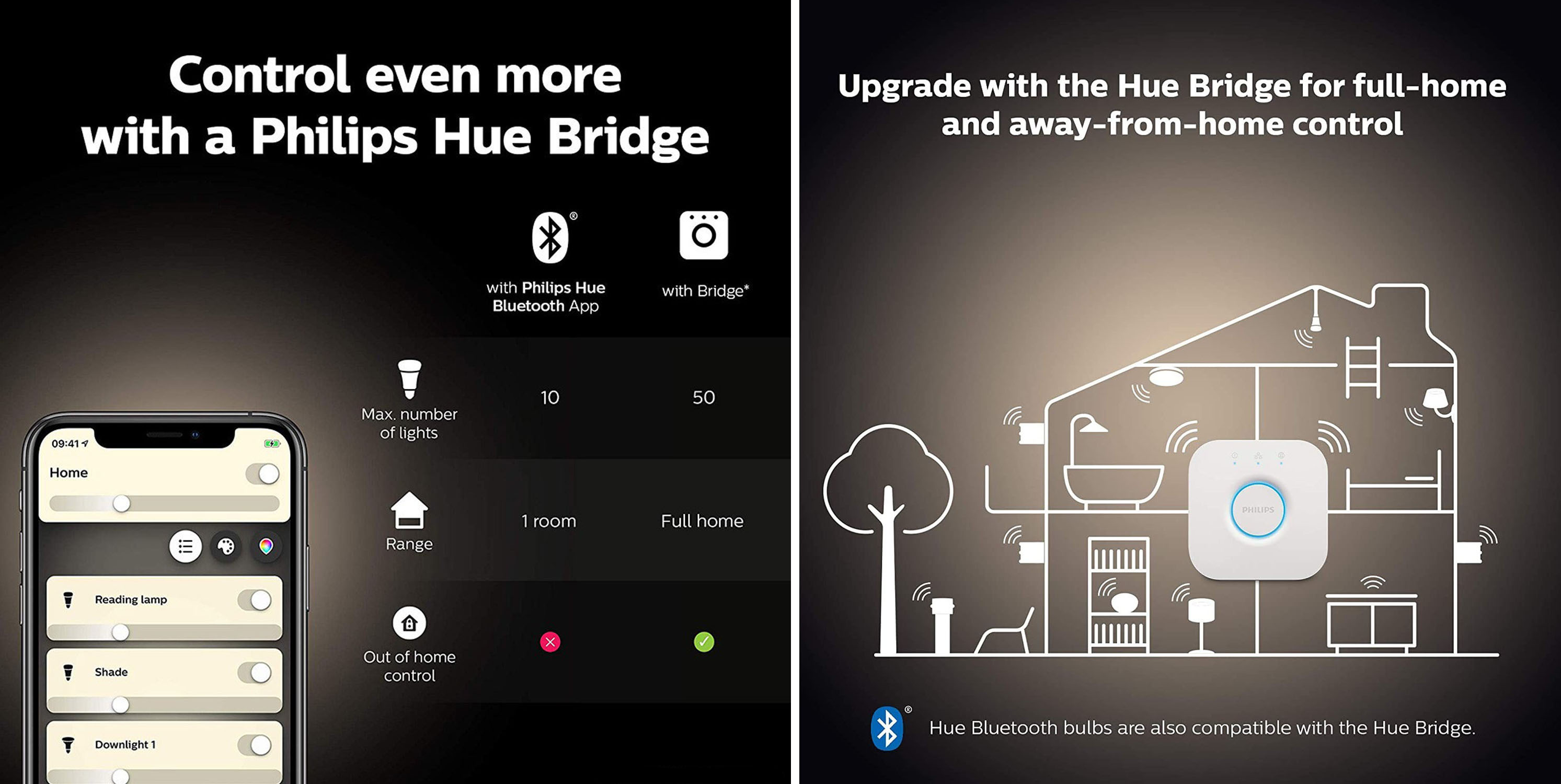 Putem Bluetooth-a možete povezati do 10 svetiljki, a putem uređaja Bridge 50. I to, kad je Bridge u pitanju, možete upravljati svetiljkama u cijelom domaćinstvu, dok Bluetooth pokriva samo jednu prostoriju. Osim toga, Bridge omogućuje upravljanje uređajima i izvan zidova vašeg doma, a nudi i sinhronizaciju osvetljenja s video igricama, filmovima i muzikom. Oba sistema nude glasovno upravljanje, prigušivanje bez instalacije i podešavanje merača vremena.