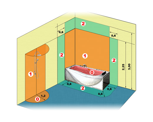 Prema stepenu opasnosti, rizični prostori u kupatilima i tuševima podeljeni su na sledeće zone: