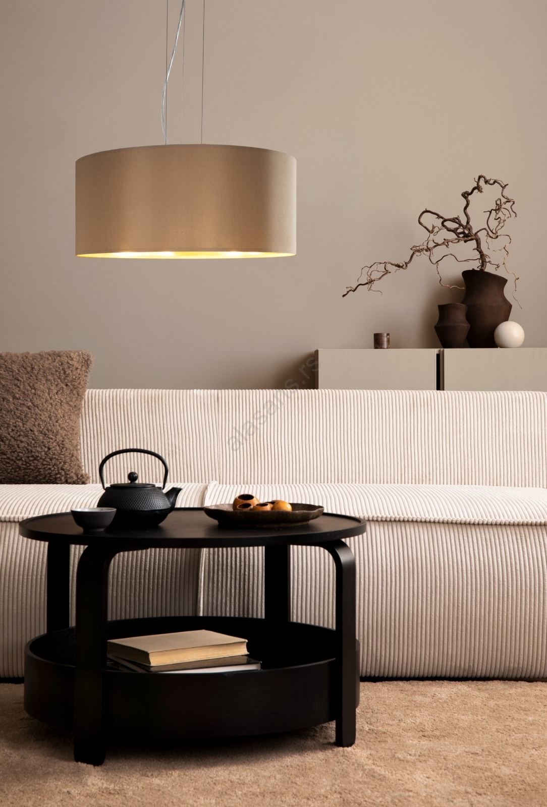 • Izgled svetiljke naglašava abažur od tekstila, spoljašnje sivo-bež i unutrašnje zlatne boje, dopunjen metalnim ovjesom.