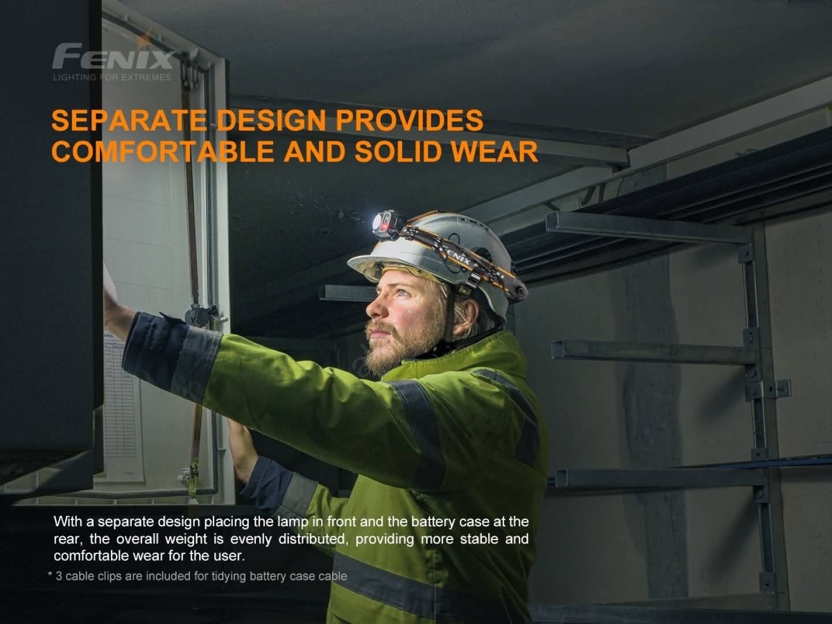 • U pakovanju se nalaze čelovka, USB-C punjački kabl, Li-ion baterija 21700, četiri kopče Fenix ALD-02 za pričvršćivanje čelovke na kacigu, rezervni O-prsteni, kopče za kabl.