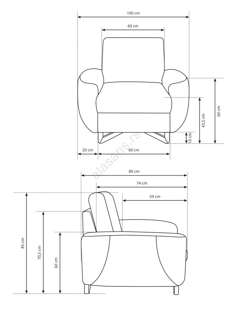 • Dubina sedenja 59 cm pruža dovoljno prostora za opušteno i ergonomsko sedenje.