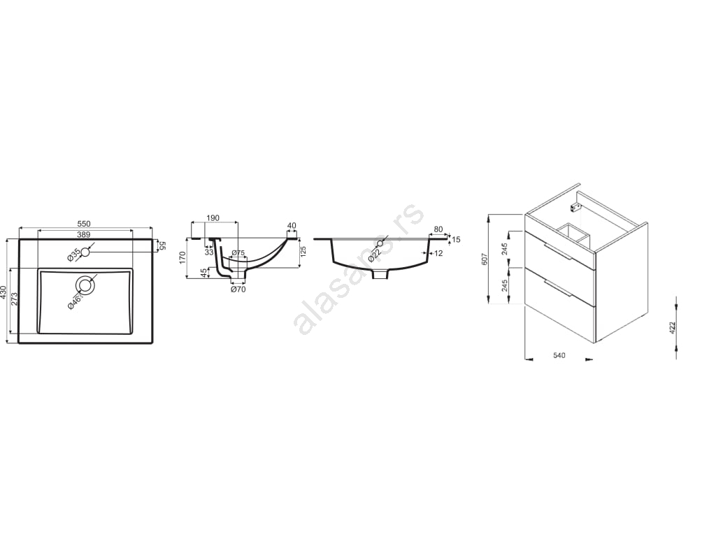 • Keramički umivaonik ima klasičan pravougaoni oblik sa otvorom za bateriju i prelivom.