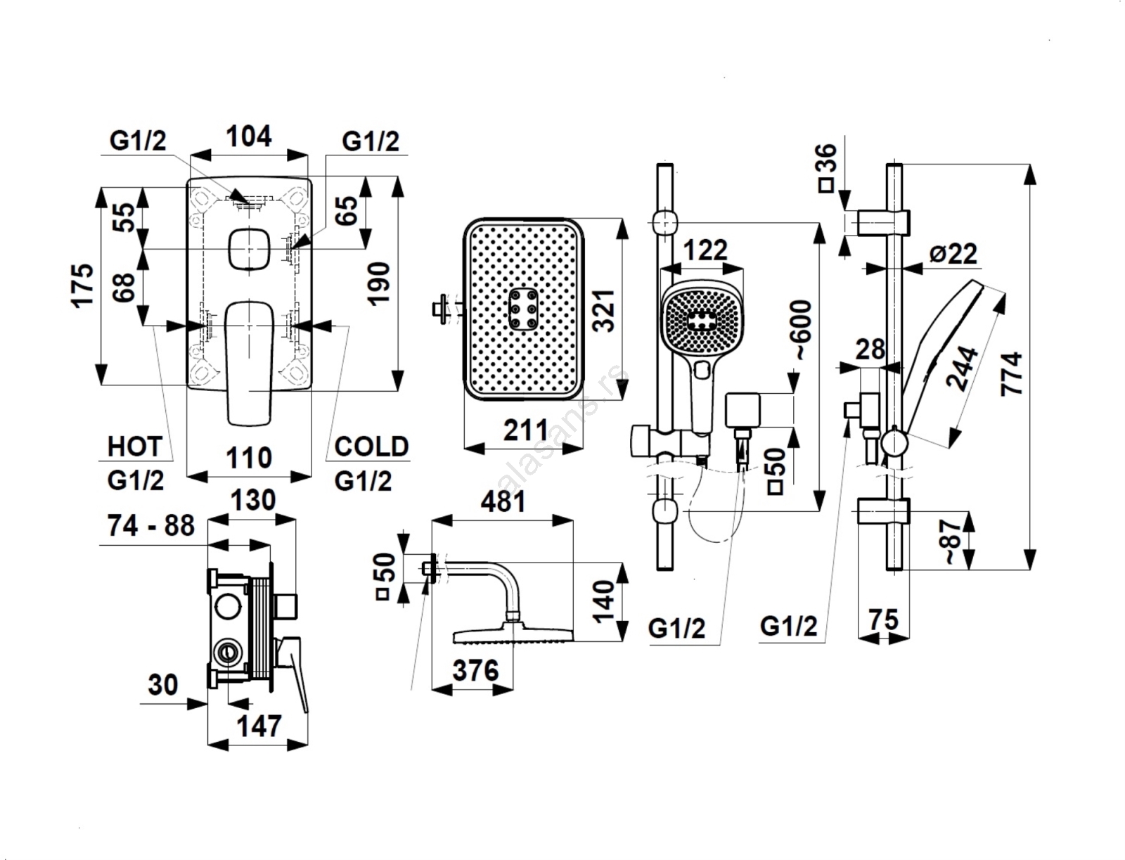 • Pakovanje sadrži: podžbukni element, kompletna baterija, rameno, tuš glava sa crevom, skriveni klizni tuš.