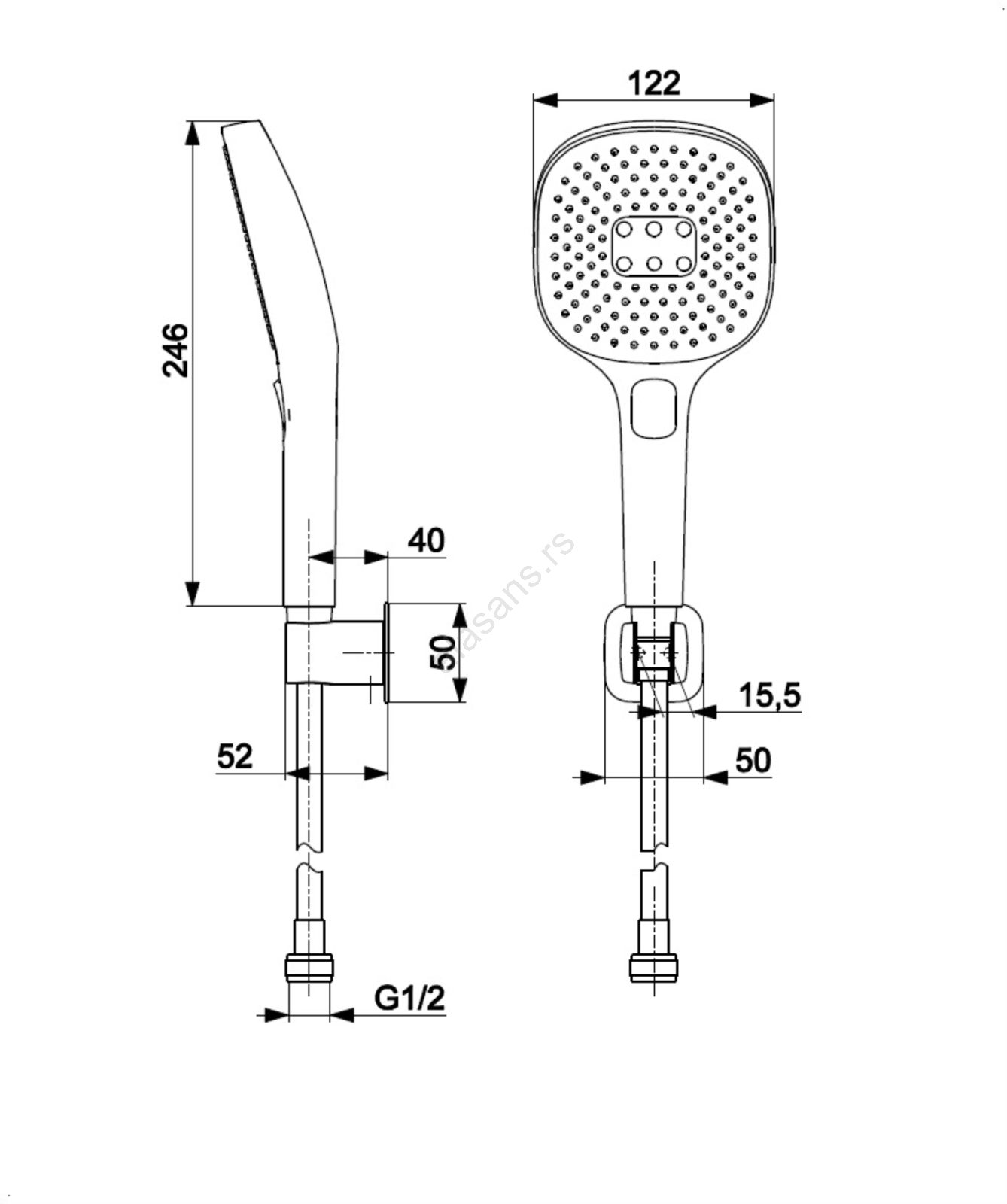• Pakovanje sadrži: podesivo zidno držalo, komplet za montažu, ručna tuš slušalica, PVC crevo (L=1500 mm).