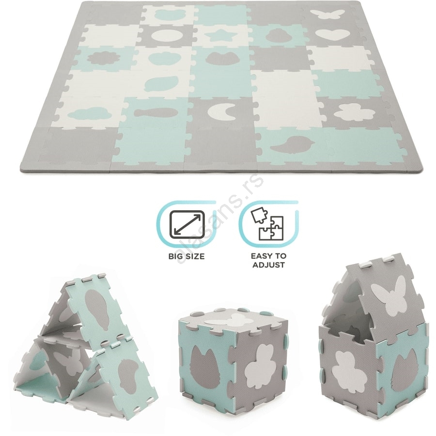 • Podloga od pene sastoji se od 30 elemenata puzzle (15 od njih ima u sredini izrezane oblike), koje možete međusobno povezivati po želji.
