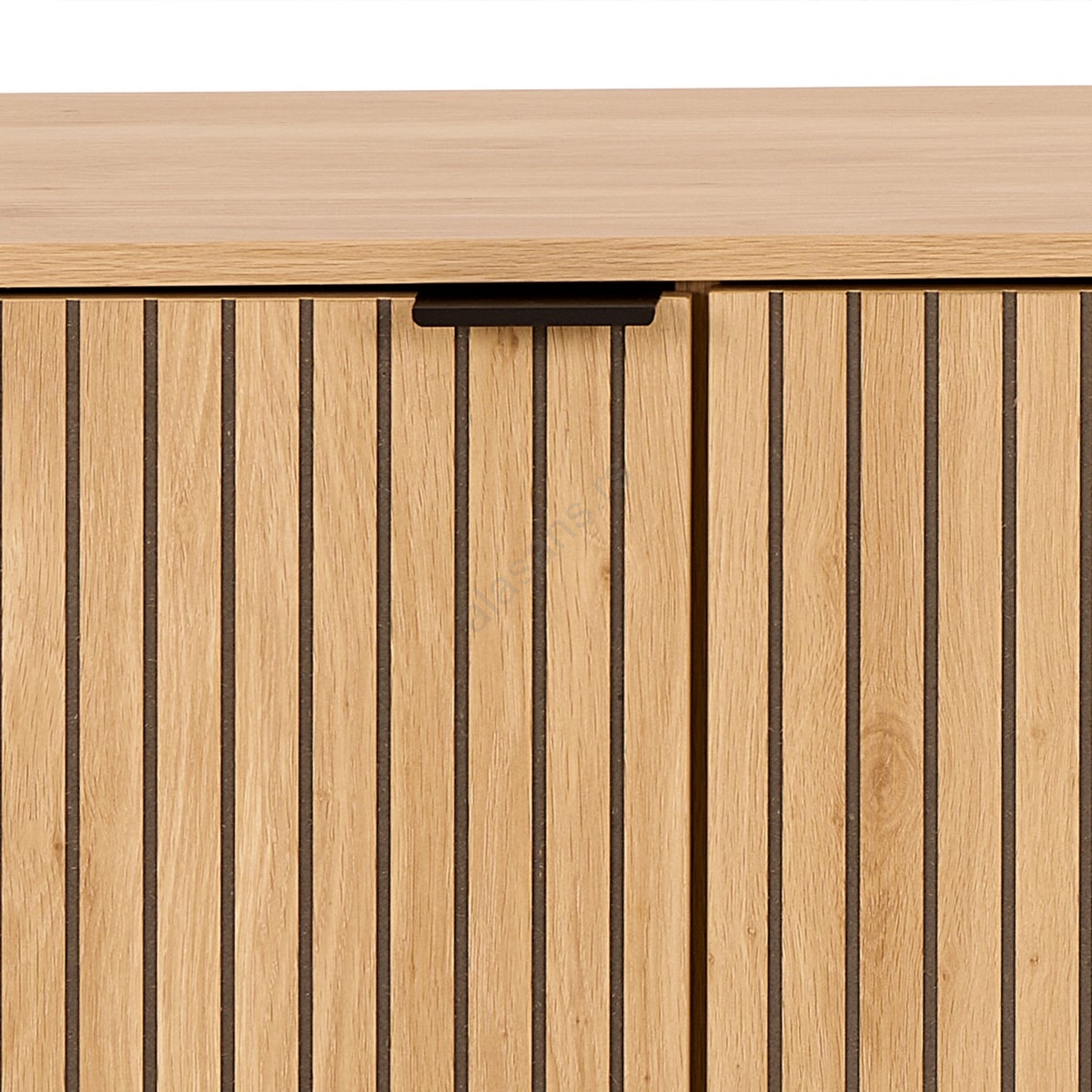 Gornja ploča, okvir, 2 vrata, fioka i 2 police u hrastovom dezenu od grubog melamina; podnožje od mat crnog, grubo praškasto lakiranog čelika sa lamelnim frontom.