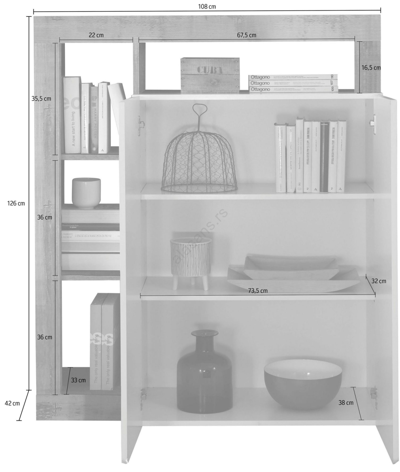 • Zahvaljujući ormarićima nudi velikodušan prostor za organizovanje predmeta za svakodnevnu upotrebu.