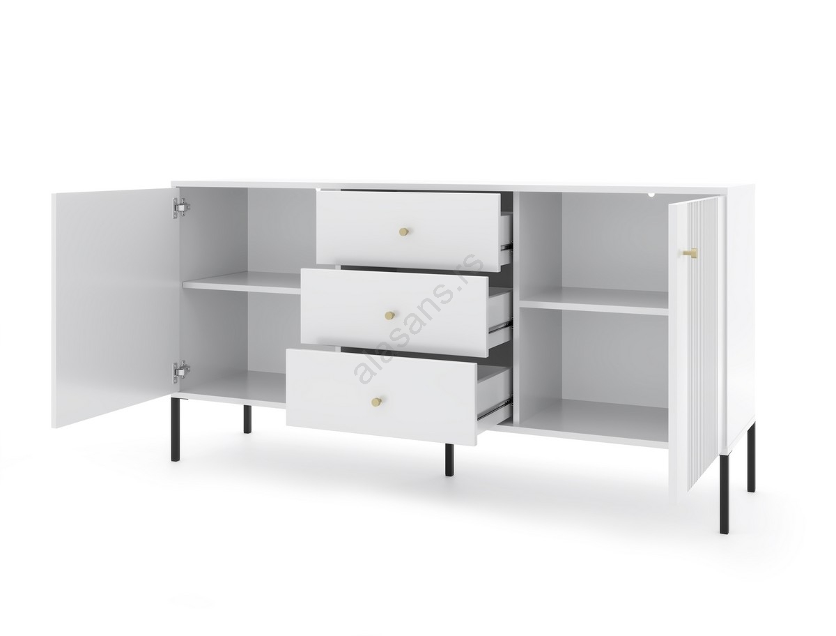 • Ima tri fioke u sredini i dve police sa vratima sa vertikalnim rebrastim detaljem.