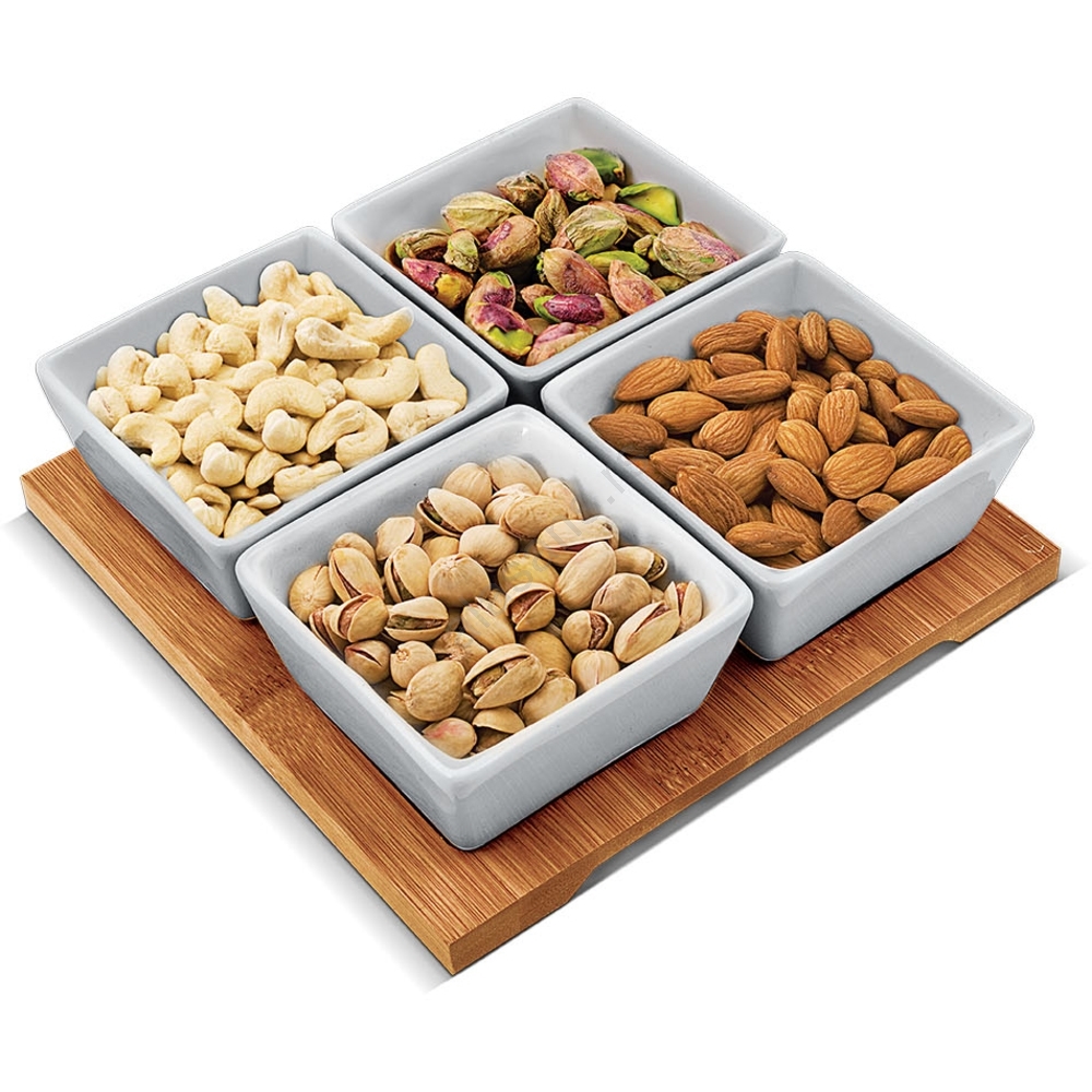 • Set sadrži 4 porcelanske činije i drveni pladanj.