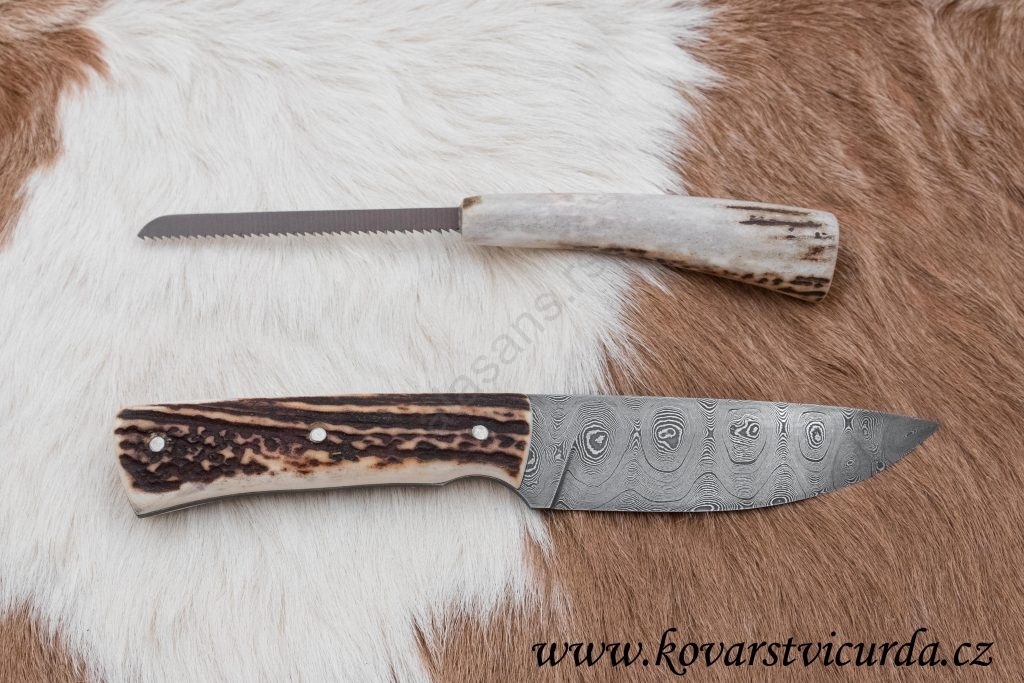 Jiří Čurda - lovački damaščanski nož sa testerom, jelenji rog.