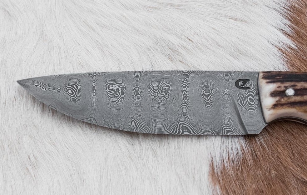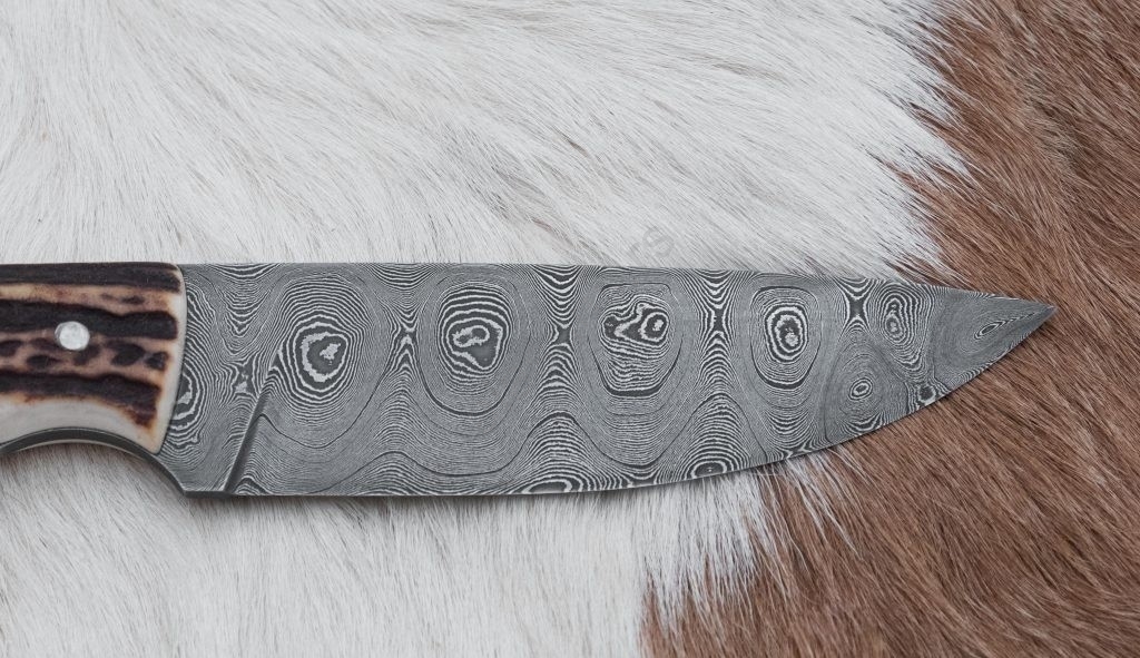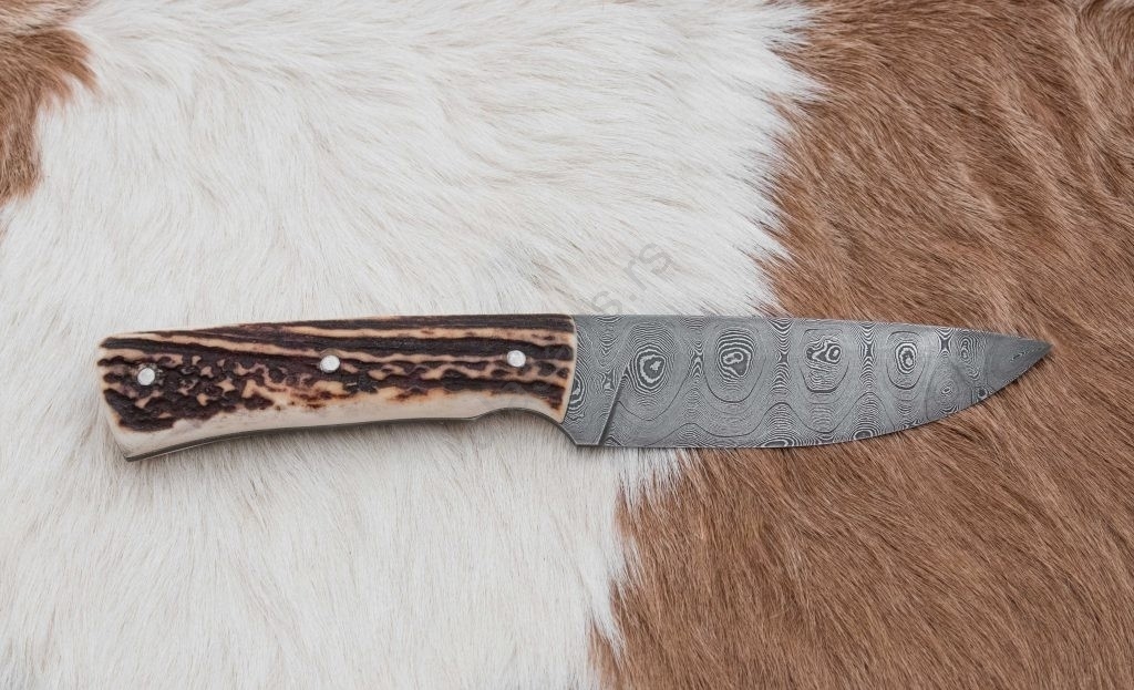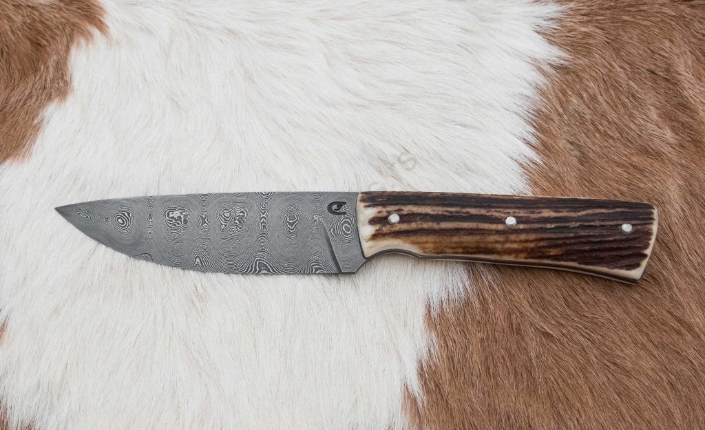 Lovački damaščanski nož sa testerom, oštrica 11 cm, drška od jelenskog roga