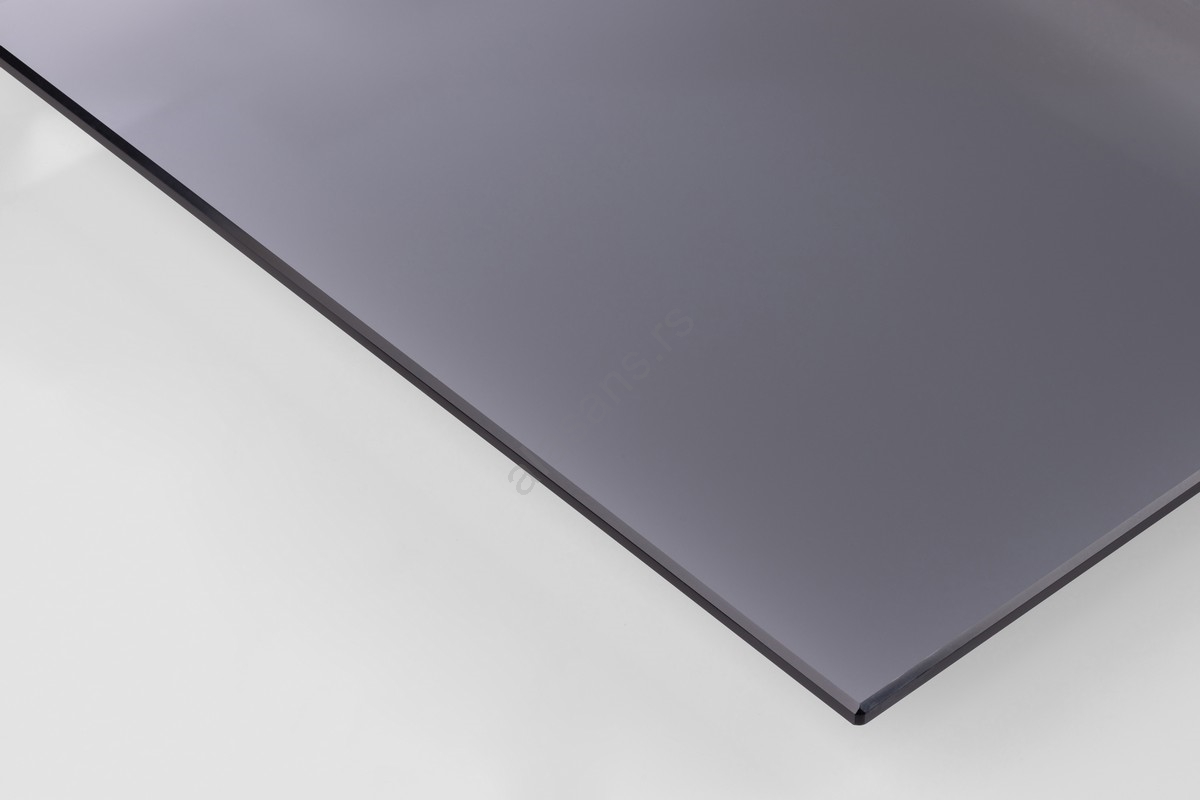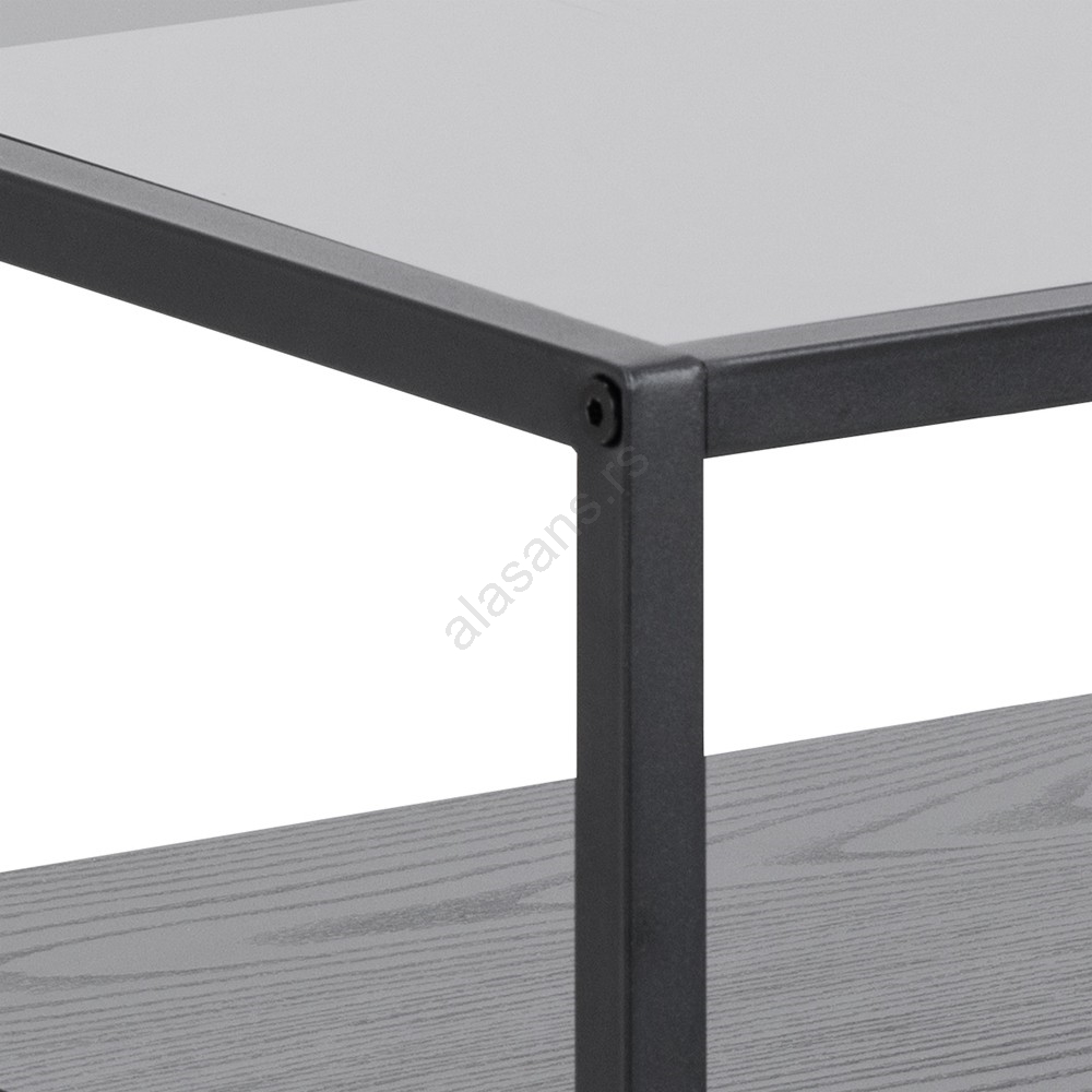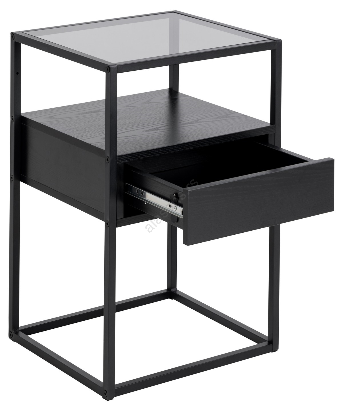 • Gornja ploča od dimljenog kaljenog stakla. Okvir, fioka i polica od crnog grubljeg melamina; noge od mat crnog, grubo praškasto lakiranog čelika.
