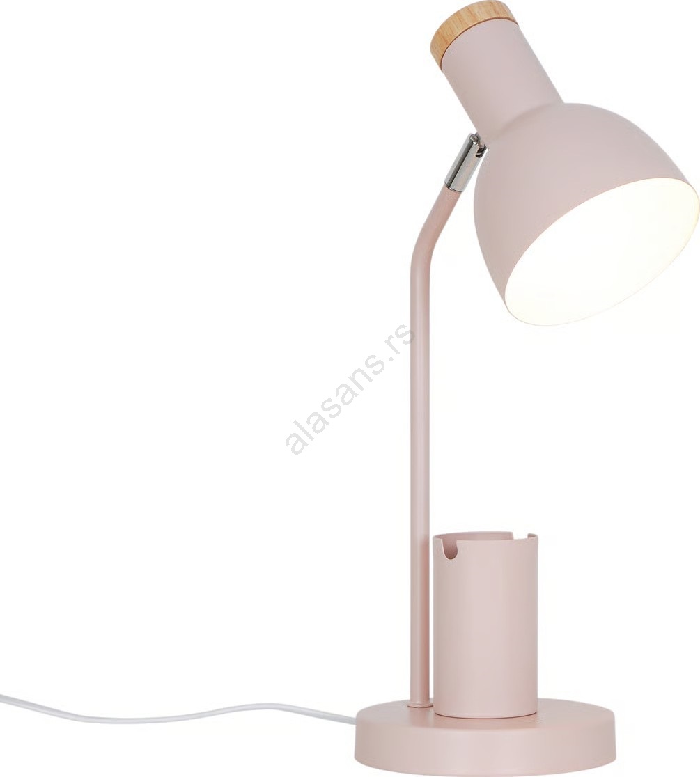 Stona lampa koja kombinuje telo sa drvenim detaljem.