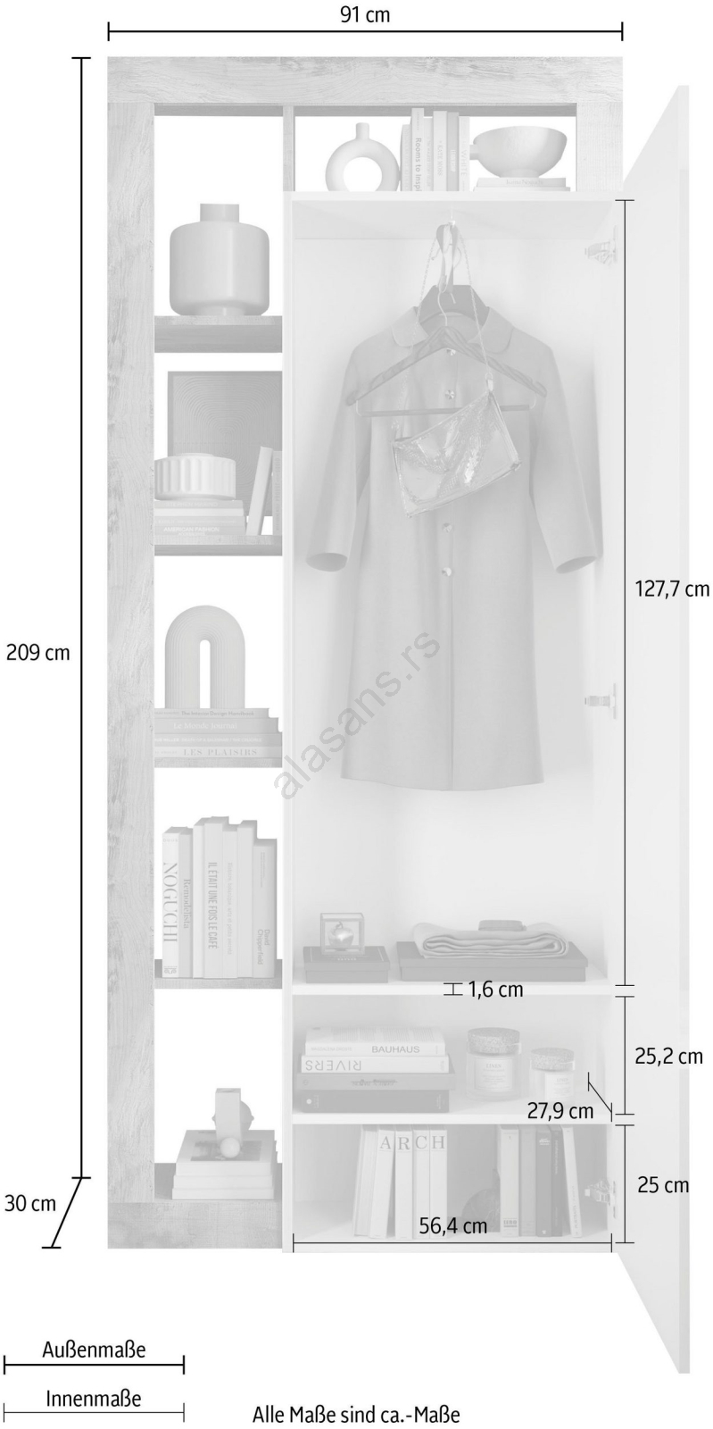 • Ormar ima 6 otvorenih polica, garderobnu šipku i 2 unutrašnje police za odlaganje torbi i sezonskih stvari.