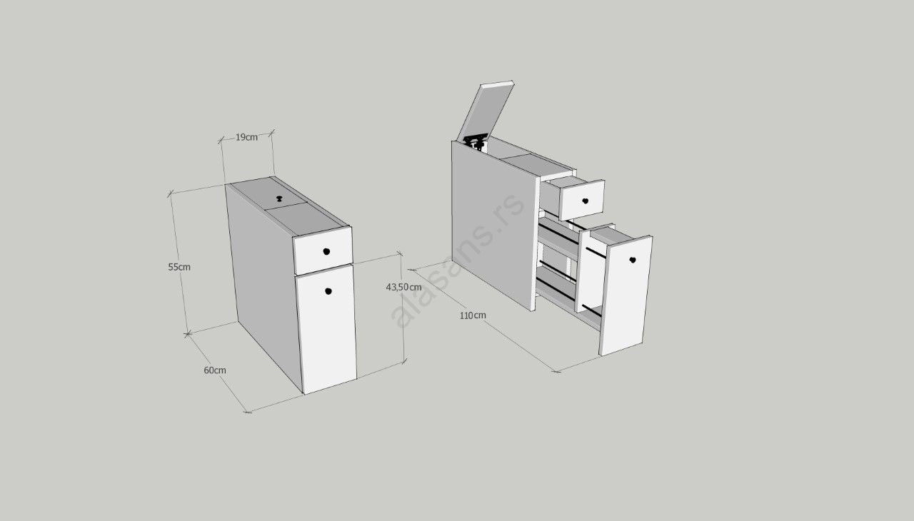 • Dve fioke i jedan prostor za odlaganje u gornjem delu ormarića.