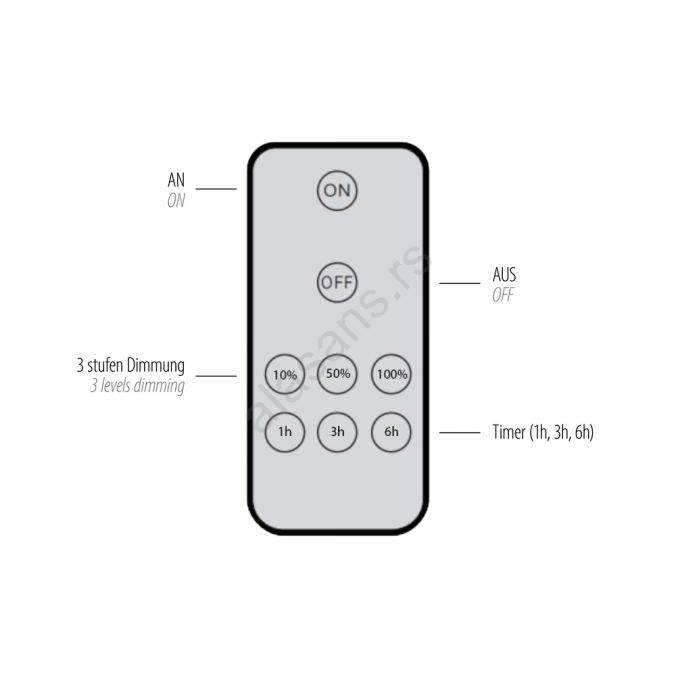 • Pomoću priloženog daljinskog upravljača možete svetlo prigušiti u tri nivoa osvetljenja: 100 / 50 / 10 %.