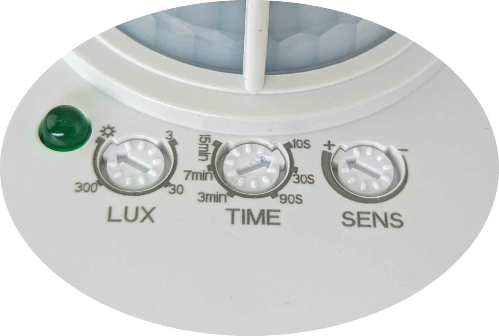 • Regulatori omogućavaju kontinuirano podešavanje: vreme (10 s - 15 min), domet detekcije pokreta (3 - 6 m), senzor osvetljenja (3 - 2000 lx).