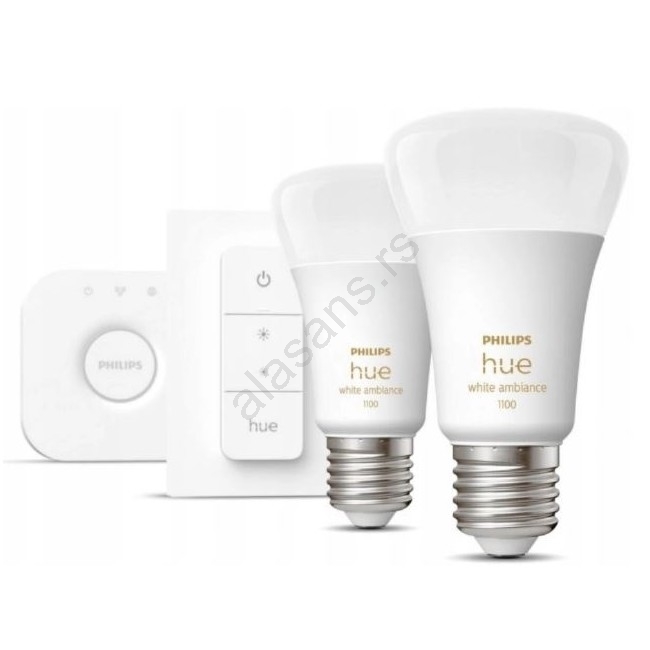 • Set sadrži uređaj za povezivanje Hue Bridge, zidni Dimmer Switch i dve White Ambience sijalice.