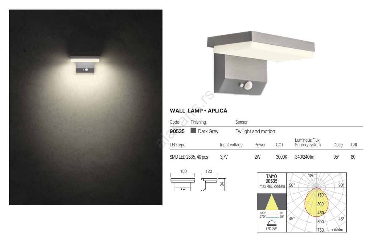 Redo 90535 - LED solarna svetiljka sa senzorom TAIYO LED/2W/3,7V 3000K IP54 antracit | Alasans