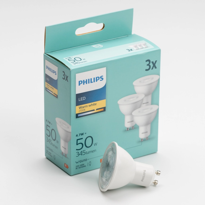 SET 3x LED sijalica Philips GU10/4,7W/230V 2700K Kvalitetan dizajn osigurat će savršeno osvjetljenje vašeg interijera. Kategorija GU10 posvećena je žaruljama s istim grlom. U našoj e-trgovini možete birati između žarulja s klasičnom žarnom niti ili velikog broja modernih LED žarulja koje su energetski učinkovitije i imaju dulji životni vijek.