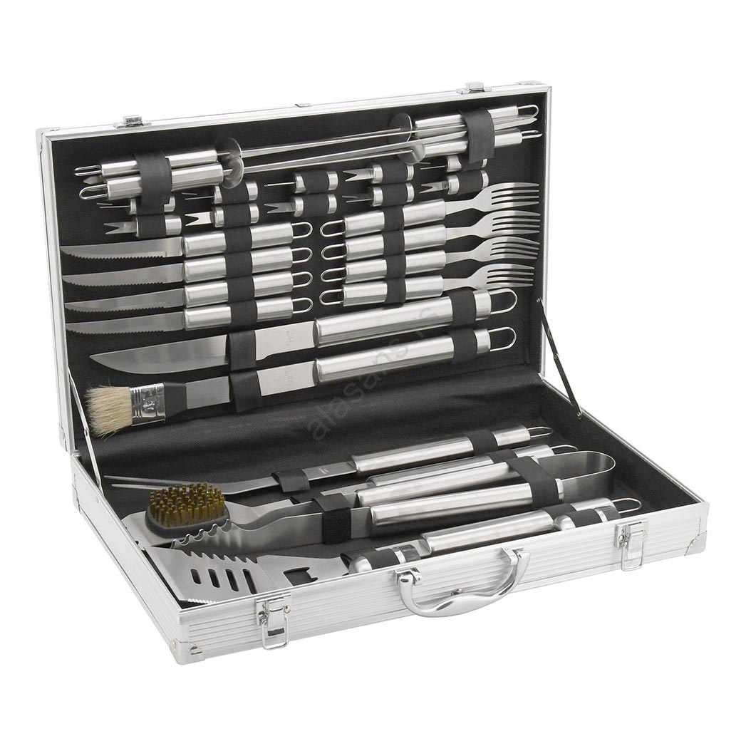Sadržaj seta: lopatica za okretanje, kliješta, viljuška sa dva zuba, četkica za premazivanje, nož za sečenje, žičana četka, 4x roštiljski ražnjići, 10x držača za kukuruz, 4x noža za jelo, 4x viljuške za jelo, soljenka, biberica.