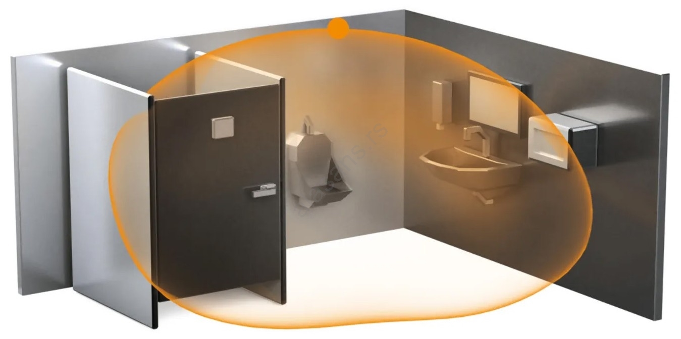 • Zahvaljujući dometu (Ø 12 m) i ukupnom pokrivanju (113 m²) idealan je za detekciju svlačionica, magacina, društvenih prostorija, hodnika, WC-a itd.