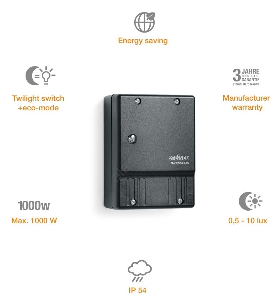 STEINEL 550516 - Prekidač za sumrak NightMatic 3000 Vario crna IP54 | Lampomanija
