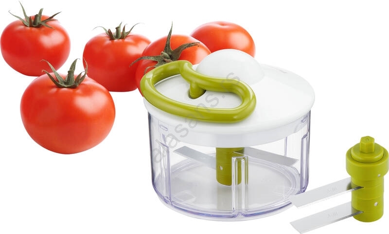 • Ne zahteva priključak na struju niti baterije, a munjevito iseče veliki spektar namirnica — od povrća do tvrdog voća i orašastih plodova.
