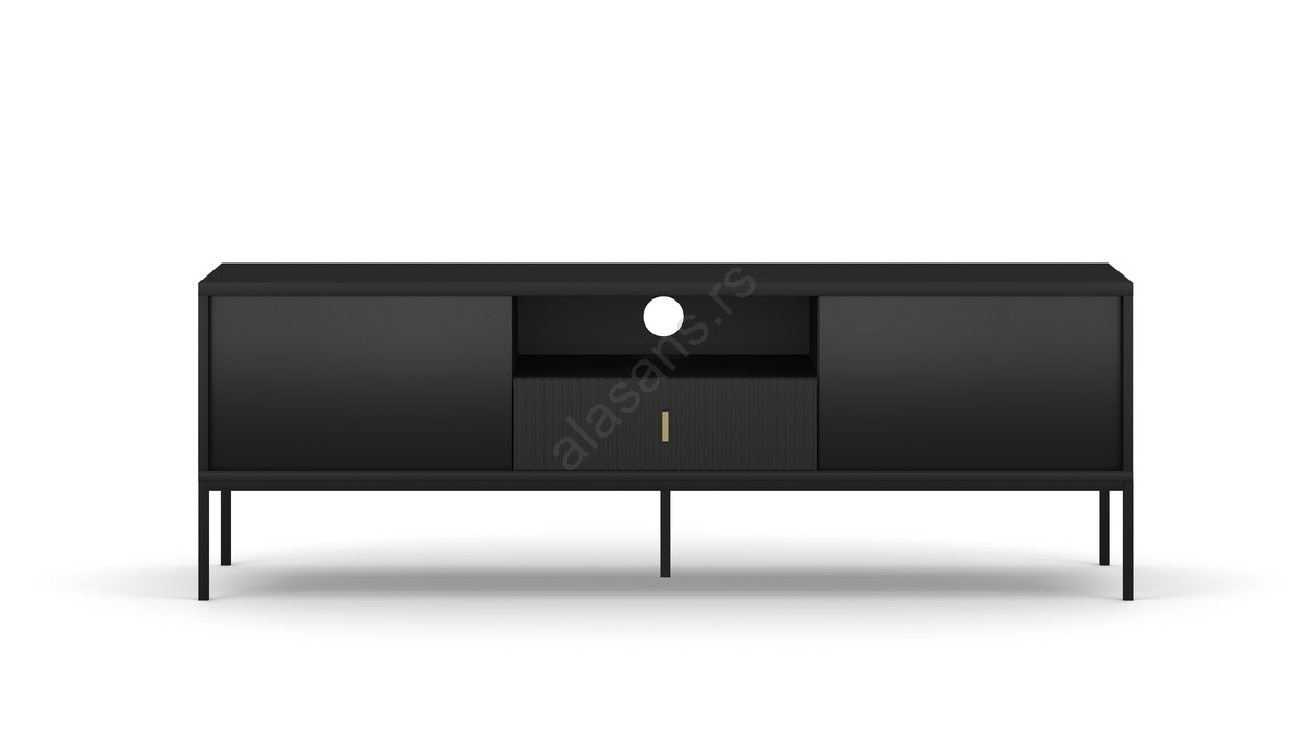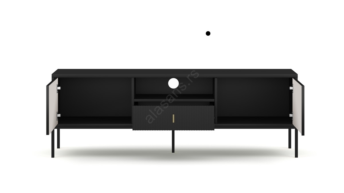 • Ima dve zatvorene bočne pregrade, otvorenu policu sa otvorom za kabl u sredini i fioku ispod police sa rebrastim frontom.