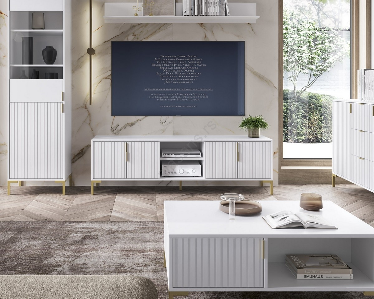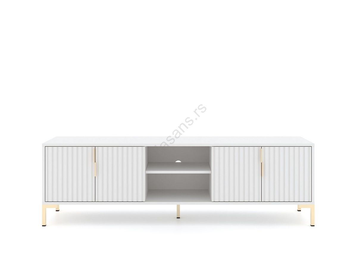 • Ima dva zatvorena bočna pretinca, svaki sa po dva vrata sa simetričnim ručkama i rebrastim detaljima, i dve otvorene police sa otvorom za kabl u sredini.