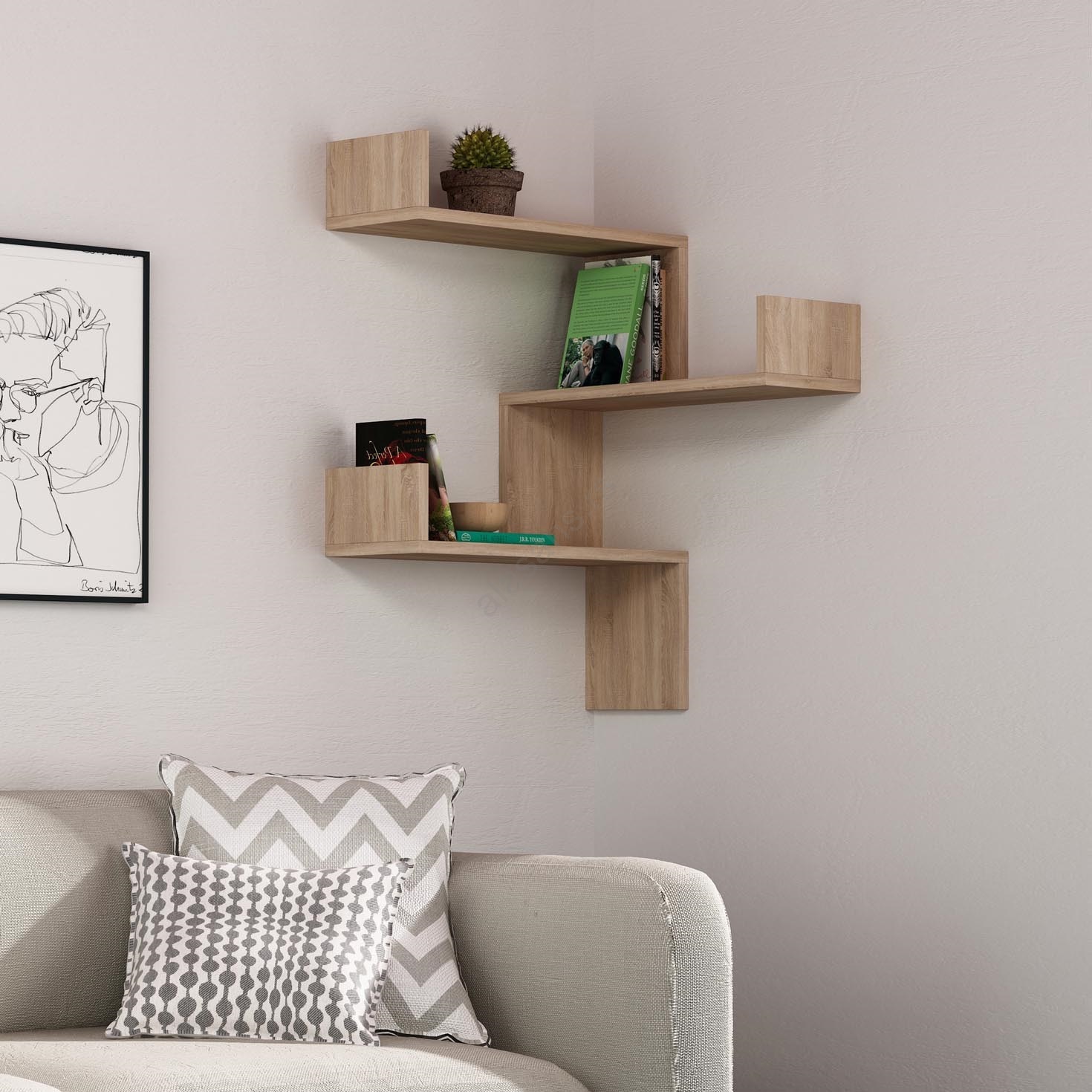 • Ugaona zidna polica sa prirodnim dizajnom.