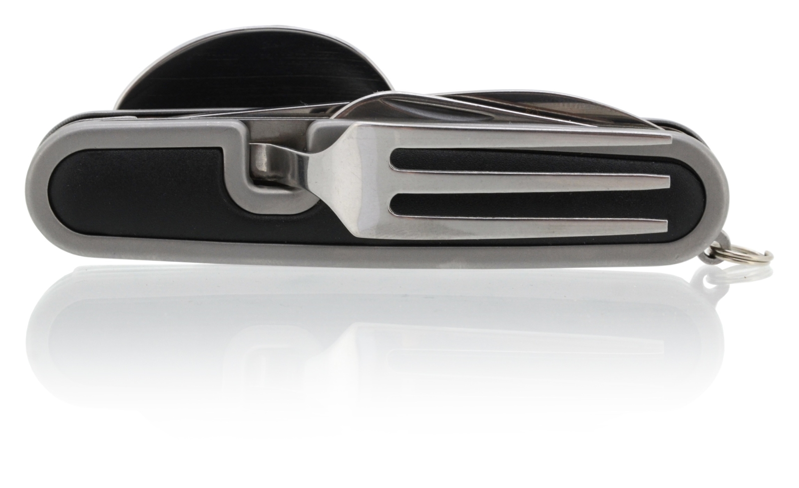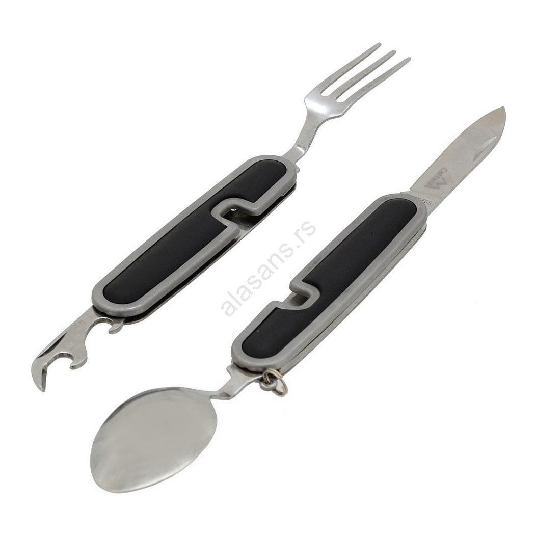 • Prvi deo noža sadrži viljušku, otvarač za limenke i otvarač za flaše, drugi deo krije kašiku i samu oštricu noža.